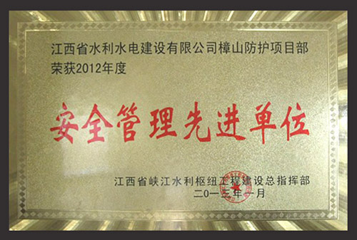 2013年2月,江西省峽江水利樞紐工程建設(shè)總指揮部授予我公司樟山防護工程項目部“2012年度安全管理先進單位”榮譽稱號,項目管理人員彭紅軍、鄧敏被評為峽江水利樞紐“安全生產(chǎn)先進個人”。