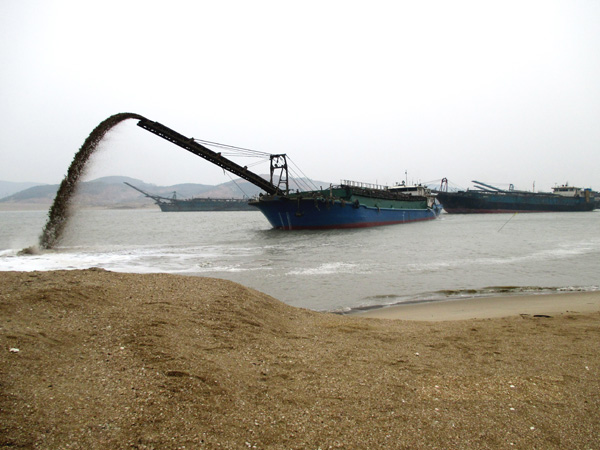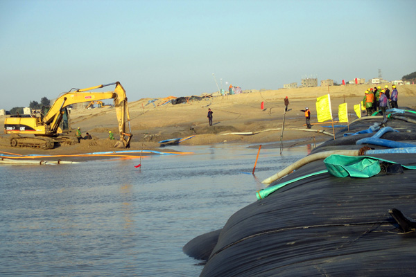 平潭綜合實驗區,主島為海壇島,位于福建省東部,與臺灣隔海相望,是中國大陸距離臺灣島最近的地方,是中國第五大島,有福建的“馬爾代夫”之稱。平潭綜合實驗區如意湖防潮閘工程項目總投資1.3億元,我公司承建的土建工程包括排澇閘、防潮閘、公路橋、上下游兩岸翼墻、防沖消能、控制房等土建工程施工(含導流明渠開挖、圍堰填筑)。平潭(簡稱嵐)年平均風速超過五級以上,大風呼嘯,沒來這里感受不到風有多大!依據工程設計及進度要求,在落差8m潮汐中的軟基上進行圍堰模袋充砂以截流海水,在惡劣地質條件的海中建閘,與潮水賽跑、跟臺風搶工期,潮起潮落,給工程建設平添了許多艱難與艱辛。