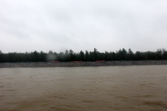 楊丕龍副廳長等冒雨登上快艇甲板察看固岸應急度汛工程