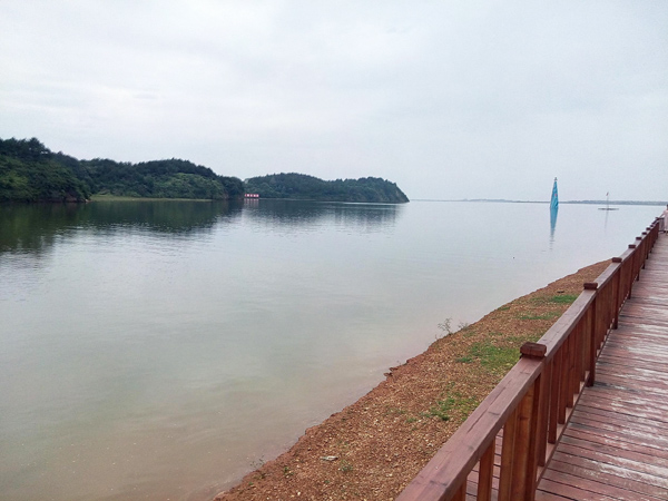 走過一段緩長的混凝土臺(tái)階,映入眼簾的是一片寬闊無垠的湖面,天青色的水面被微風(fēng)揉出一段段波紋,宛如一匹極其細(xì)膩柔軟的綢緞。湖面點(diǎn)綴的,除了長滿了藏青色樹木小島外,還有一艘艘或藍(lán)白或紫紅涂裝的游艇,在碧波之上劃出一道道雪白的弧線。一艘紅柱黃瓦的游舫緩緩駛離臨時(shí)的游客碼頭,幾只野鴨伴隨著游舫歡快嬉戲。