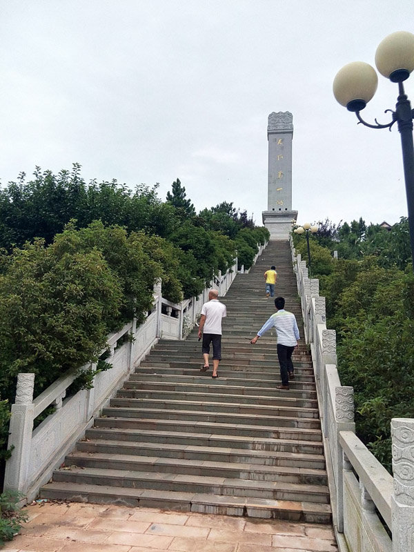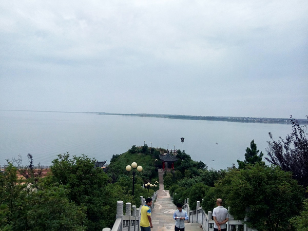 除了饒娥像,其對(duì)面的斗笠山也是美景所在之處。入山前,首先看到的是一條由青石板鋪成的臺(tái)階,臺(tái)階蜿蜒陡峭,兩側(cè)是漢白玉雕欄,欄上雕龍繪鳳,栩栩如生。抬頭仰望,只見臺(tái)階盡頭是一座高聳的石碑,燙金而書“天下第一碑”幾個(gè)大字。一路走走停停到了石碑前,眼前豁然開朗,放眼瞭望,到處一片茫茫水面,碧波蕩漾,翻起碎玉點(diǎn)點(diǎn)。窮極目力,水天一線之間,一座三角錐狀燈塔若隱若現(xiàn),“浩渺鄱湖水接天,波翻浪涌競爭先;連江通海胸懷廣,滋養(yǎng)生靈歲復(fù)年。”余老的《鄱陽頌》誠不欺我。臺(tái)階中央又有一小平臺(tái),連接至一片紅墻黃瓦的走廊,廊前紅墻上鑲嵌著墨色的石板,上面刻著一些當(dāng)代大家對(duì)鄱陽湖的見聞和贊譽(yù),筆走龍蛇,字體蒼勁,令人賞心悅目之時(shí)不免肅然起敬。走下斗笠山,已經(jīng)接近傍晚,金日西斜,站在饒娥像后眺望,湖面一片金鱗銀濤,美如油畫。