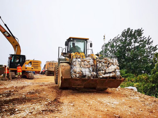 7月14日14時,封堵作業(yè)正式啟動,南北兩岸同時進占施工。然而,困難層出不窮:道路不平,存在積水,影響車輛通行;一線搶險人員的生活保障還不夠完善,吃住條件艱苦,防雨防曬防蚊設(shè)施簡陋,無便攜照明設(shè)施;砂石骨料耗量巨大,但存在配額限制,獲取來源較少。但現(xiàn)場人員攻堅克難,積極與政府、當(dāng)?shù)丶捌h廠商溝通,解決了人員基本需求和石料問題,并在當(dāng)日順利鋪石20米,邁上堅實的第一步。