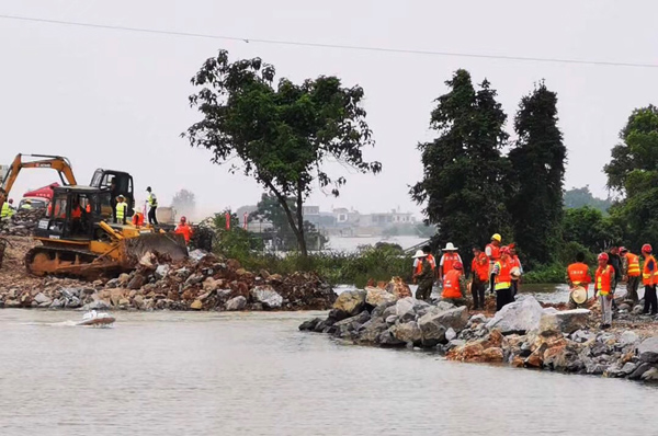 公司技術(shù)組專家張周平、王俊華、曾朝文,彭燦華等領(lǐng)導(dǎo)在現(xiàn)場進行技術(shù)指導(dǎo)。專家組研究發(fā)現(xiàn),當(dāng)日水流過大,石料來源缺失,難以立即對決口進行合攏施工。需要待水流平穩(wěn),石料來源落實后,才可開始。